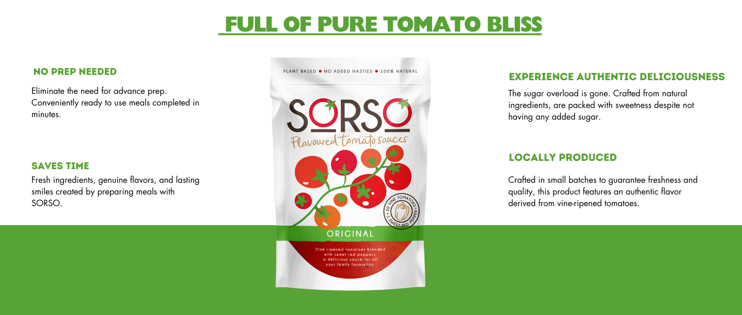 There’s something immensely satisfying about a homemade pasta sauce – and SORSO takes tomato sauces to another level! Use our Original Flavoured Sauce to dress up your pasta dishes or for other meals that need the added rich, smooth creaminess packed with the flavour of premium quality, vine-ripened juicy tomatoes. Our Original Flavoured Sauce is as fresh as possible, nutritious, more than yummy and luxuriously appetising.